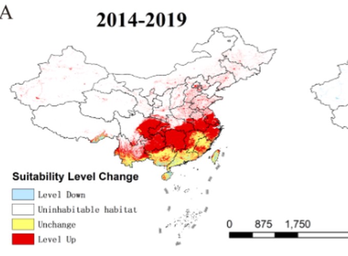 Background Global warming, urbanization and the resumption of global population movements post-COVID-19 have made the prevention and control of dengue and its vector transmission more challenging. To tackle this issue, this study evaluated and predicted the suitable habitats of Aedes albopictus and Aedes aegypti in China. This study aims to identify the key influencing factors, analyze patterns of habitat expansion and contraction, and explore regions in China at risk of dengue fever outbreaks in the future. Methodology/findings This study utilized mosquito distribution data from 2010 to 2023 and employed Maxent to map the distribution of suitable habitats. The key influencing factors and response curves were further analysed, and patterns of habitat expansion and contraction were investigated. The findings reveal that the main variables affecting the distributions of Ae. albopictus and Ae. aegypti are annual precipitation, annual mean temperature, and land use and land cover changes. The suitable habitat for Ae. albopictus shows a significant northward expansion trend, reaching large areas in Shandong and Henan province by 2030. The suitable habitat area for Ae. albopictus is increasing annually and can reach approximately 2.38 million square kilometers by 2030. Compared to the outbreak year of dengue fever in China in 2019, the suitable habitat area for Ae. albopictus in 2030 will increase by approximately 17.06%, with a growth of 2.57% in the sum of high-risk and medium-risk suitable habitat areas. In contrast, the suitable habitats of Ae. aegypti are primarily concentrated in Guangdong, Hainan and Yunnan Provinces. Conclusions This study compared the potential changes in the distributions of suitable habitats for Ae. albopictus and Ae. aegypti in 2014, 2019, and 2023 and predicted suitable habitats for 2030, as well as contraction and expansion trends in the suitable habitats of Ae. albopictus. The findings aim to identify regions at risk of future dengue fever outbreaks in China, providing a scientific basis for public health authorities to develop effective dengue prevention and control strategies.